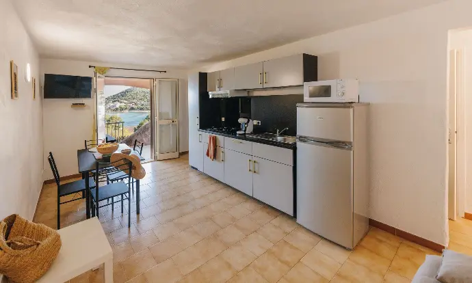 Appartement climatisé à Tarcu pour 4/6 pers. 38 m2. Possibilité 1er étage ou RDC. Séjour équipé d'un canapé convertible et coin cuisine, une chambre équipée d'un grand lit double, une deuxième chambre équipée d'un lit superposé, salle de bain et wc séparés. Terrasse couverte ou balcon couvert avec Vue Mer.